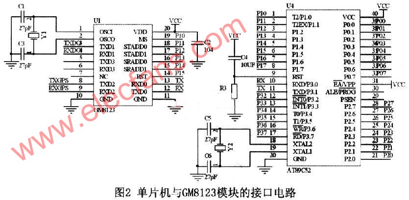 系统选用广泛应用的AT89C52单片机作为MCU。其内部有8k字节的Flash程序存储器和1256字节的RAM。该单片机内部仅有一个通用异步串口。为了能够同时与GPS以及GSM模块通信,单片机需要两个串口。所以本系统利用串口扩展芯片GM8123实现对GPS数据和GSM数据的同时收发。单片机与GM8123模块的接口电路如图2所示。