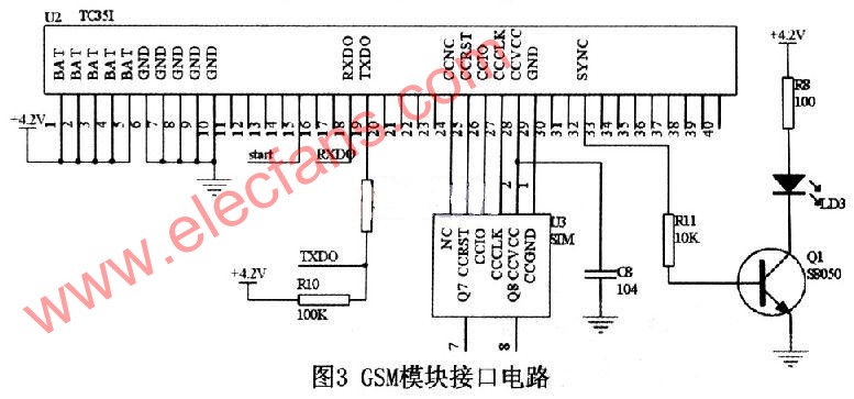 GSM模块负责在被保护对象和监控用户之间传递信息。本系统采用德国西门子工业的GSM模块TC35i。TC35i模块是一个的工业级GSM模块,工作在 GSM900和GSMl800双频段,支持中文短信息。TC35i的数据接口(CMOS电平)通过AT命令可双向传输指令和数据,它支持Text和PDU 格式的SMS(短消息)。GSM模块接口电路如图3所示。