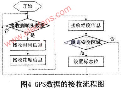 本系统采用的GPS模块为SIRF第三代高灵敏度引线式GPS接收模块SIRF starⅢ。该芯片定位精度在10m以内,最多可以同时追踪20个卫星信道。其内部有可充电电池,可以保存星历数据,便于快速定位。串口数据格式为TTL 电平数据输出,通讯速率为4800通讯波特率,每秒输出一次GPS全数据。该模块GPS天线采用MMCX接口,数据线接口为6线接插件,排线输出,使用简单,一般情况下只需用到三根输出线,第一脚接3.5~5.5V的直流正电源,第五脚是电源地,第二脚是GPS的输出线,它是TTL电平的串口信号,高电平大于2.4V,低电平小于0.4V,输出驱动能力为2mA,可以直接和单片机接口。如果只使用默认设置,单片机只从该模块读取数据即可。2 系统软件设计