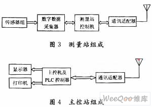 在数字系统组成中,模拟信号经由传感器组传输到数字数据采集器中,经过滤波、放大、模/数转换等转换成数字信号传入测量站控制机。控制机经由Intel公司的WIFI无线网络端口与主控机进行无线联网,通过对主机与测量站控制机的分别设置,使测量站控制机成为主控机的一个远程终端,实现对其完全远程控制。通过无线网络,测量站控制机采集的实时数据及图象传输至主控机,同时主控机对测量站控制机进行全面控制,并且通过RS 232端口或USB端口控制其他外围设备。如果在测量过程中,无线信号传输有较强烈的干扰(如X射线干扰),可利用无线网络进行机器工作状态预览。测量站控制机采集实时数据并存储,干扰去除后,再把有用信号无线传输至主控机。主控机在接收信号的同时并控制测量站设备进行下一次信号采集准备,一切就绪后,打开采集系统进行下一次工作。如此添加中间存储环节,通过全数字的无线信号传输,提高了数字信号传输精度,也提高了抗干扰能力及控制精度。