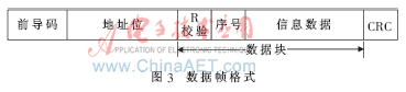 为了提高收发数据的正确率,除了nRF905的CRC校验码之外,设计中还将非授权用户之间收发的数据块第一个字符标志为‘R’。接收方接收数据时只在第一个字符‘R’ 校验正确时才保存该数据。数据帧格式如图3所示。