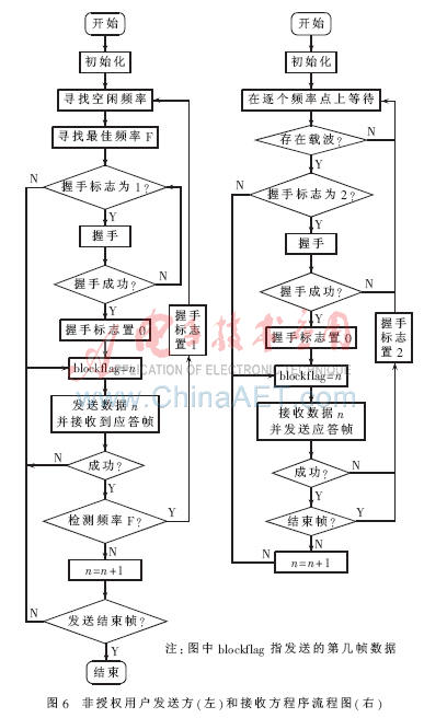 系统软件设计采用标准C语言在IAR开发环境下编写调试。图 6为非授权用户发送方与接收方从频率选择到发送数据的程序流程图,省略了液晶显示器部分。