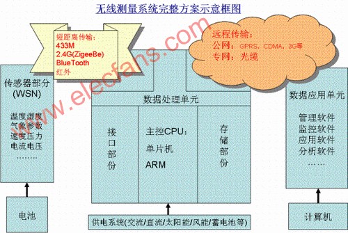 一个完整的无线测量网络无非有三部份组成:传感器部分(WSN),数据处理部分,数据应用部分。见图1所示。