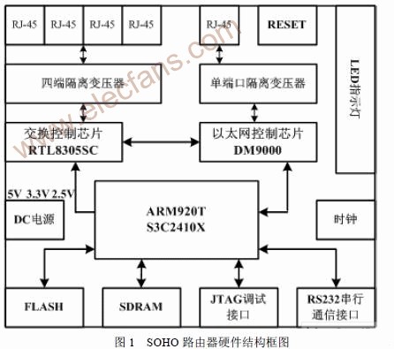S3C2410X 微处理器通过系统总线连接FLASH和SDRAM构成存储系统,系统上电后,微处理器从FLASH 中读取初始化程序,SDRAM 为程序运行和数据处理和转发提供临时存储空间。以太网控制芯片DM9000,经单端口隔离变压器和RJ45 接口与互联网相连。DM9000 通过MII(独立媒体接口)与交换控制芯片RTL8305SC 的PORT4 口相连,RTL8305SC 经过4 端口隔离变压器和四个RJ-45 接口连接局域网集线器,交换机或电脑,进行数据交换或通过微处理器控制与广域网连接。