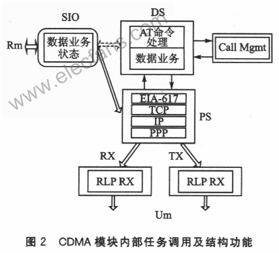 操作系统自身提供的Socket API函数基础上进行网络应用层程序开发,实现了CDMA无线模块的TCP/IP协议的AT命令支持。用户只需通过模块串口输入/输出相应的AT命令即可实现TCP/IP协议的调用,以达到连接Internet的目的。系统采用CDMA系统支持的分组数据业务(Packet DataSetvice)进行数据传输。分组数据业务充分共享无线信道,采用IP Over PPP实现数据终端的高速、远程接入,以数据流量计费,传输速率可达14.4 kbps,是收发随机突发数据的最佳选择。图2为CDMA模块内部任务调用及软件结构功能图。