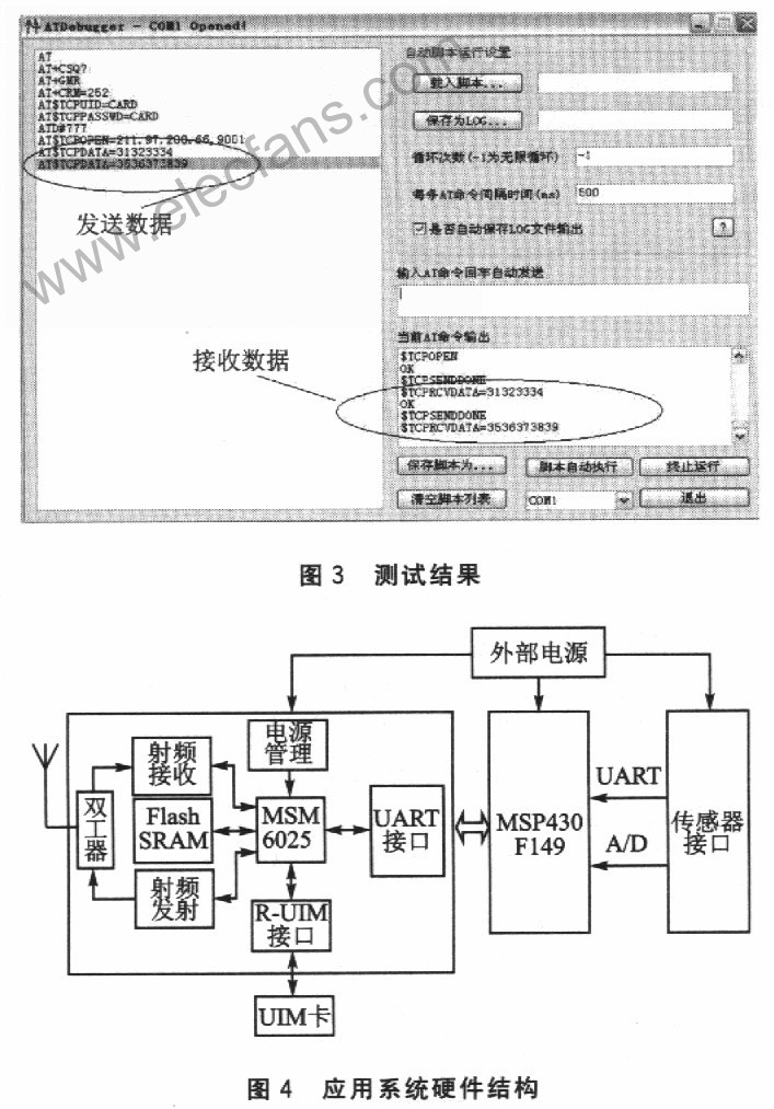 2 测试及应用 将CDMA无线模块通过串口与PC机相连,PC机上运行串口调试程序,向模块发送AT命令,与联通给定的服务器IP地址建立连接,应用其测试端口,发送数据并接收回显数据。