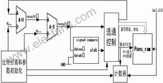 在减法器端,当前误差值e减去eminus,该数值同时送给数值比较器和选通控制模块。减法器的输出结果和0值作比较,如果结果小于零则记P比特为1;如果结果大于零则记P比特为0,同时将减法器的输出结构作为当前加法器的A端输入值。P比特则在选通控制模块产生的读写使能、地址