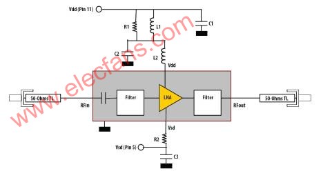 下图1为Avago的ALM-1712产品,由两个FBAR滤波器和一个LNA组成,三级总的噪声系数为1.65 dB 。RF端ESD >3KV,省去外加ESD保护器件,节省空间和成本。低至1V 工作,可关断功能则满足了手机应用低功耗的要求,可变偏置则提供了在各个性能指标中得到一个理想的平衡。 封装为4.5(L)x2.2(W)x1(H) mm3,外围器件只有8个电阻,电容和电感器件。