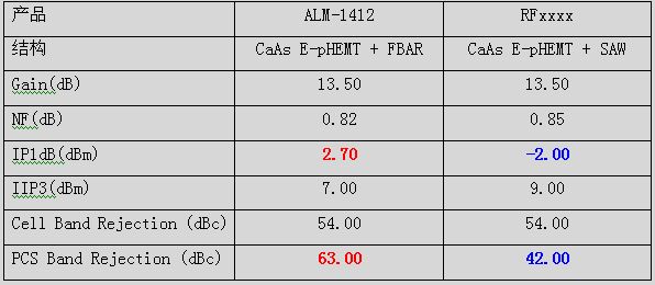 下面是市场常见的两个型号的主要指标,在低噪放都采用CaAs E-pHEMT工艺的情况下,不难看出FBAR滤波器对PCS频段的抑制比SAW高出21dB( 63 vs. 42)