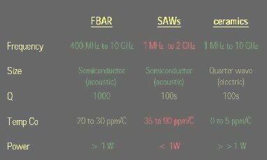 陶瓷滤波能承受较大的功率,温度特性好,但器体积大,Q值不如FBAR的好;