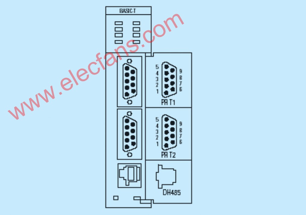罗克韦尔自动化公司生产的BAS-T模件是用于SLC500系列PLC的一种高性能的通讯模件。BAS-T模件具有两个可编程的串口,支持RS-232、RS-422、RS-485通讯。它可以通过1746 I/O背板与一个SLC500 CPU通讯或者通过它自带的DH485端口与DH485网络通讯。在BAS-T模件内部有24kB电保持RAM,还可以选用8kB或32KkB的非电保持内存模块。BAS-T模件具有八个LED灯用来指示其工作状态。BAS-T模件的外观如图1。LED灯定义如图2。