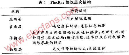 为了满足汽车线控技术的需求,FlexRay联盟于2005年发布了FlexRay总线协议。其主要特点有:双通道传输,每个通道的传输速率高达lO Mb/s;具有灵活的使用方式,支持多种网络拓扑结构;负载率高;提供冗余机制。