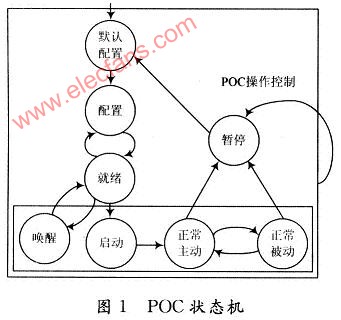 FlexRay协议操作控制(Proposal Operation Control,POC)将通信状态分为几种状态,分别为:配置状态(默认配置、配置);就绪状态;唤醒状态;启动状态;正常状态(正常主动、正常被动);暂停状态。其状态转换图如图1所示。当控制器主机接口(Controller Host InteRFace,CHI)给通讯控制器(CC)发送命令后,CC从暂停状态进入默认配置状态,满足配置条件后进入配置状态,完成网络初始化和节点通信任务初始化;之后可以进入就绪状态,完成节点内部通信设置,如果没有满足通信就绪条件,就返回配置状态继续配置;在就绪状态,CC可以发送唤醒帧,唤醒网络中没有在通信的节点,也可以获得CPU的启动通信命令,完成与FlexRay网络时钟同步;启动成功后进入正常状态,完成数据的收发;当出现错误时,可由正常状态进入暂停状态,重新等待CHI命令。
