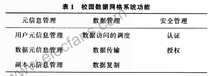 校园数据网格系统的功能主要分为3部分:元信息管理、数据管理和安全管理。如表l所示。