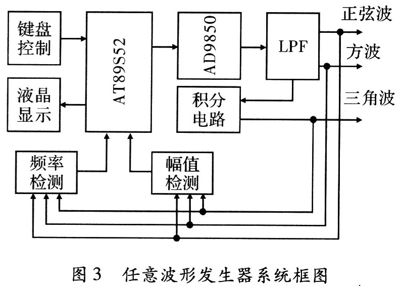 该信号发生系统是以单片机AT89S52为控制器,以DDS芯片AD9850为核心,通过单片机控制功能芯片来实现频率预置、控制字设置等产生相应的信号输出。AD9850实现信号发生器功能,微处理器控制D/A转换器,实现各种信号幅值的可调性。整个信号发生系统的硬件电路主要由单片机及外围控制电路、正弦信号发生器功能电路、积分电路、滤波电路和检测电路等5部分组成,系统框图,如图3所示。其中键盘采用4×4矩阵式,主要用以设置频率和幅值;波形采用LCDl602液晶显示;LPF低通滤波和积分电路都采用模拟集成芯片LM324实现。
