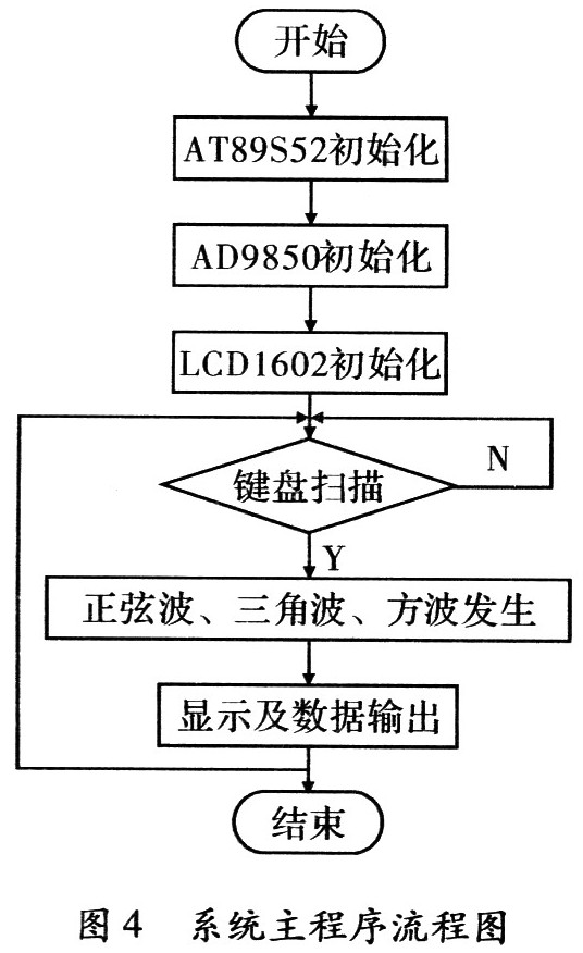 系统软件设计采用汇编语言与C语言相结合来编写程序,这样不但提高程序对电路硬件的可控制性,同时也增加了程序的可读和可移植性。软件模块包括主程序(AT89S52初始化、AD9850初始化、LCDl602初始化)、显示子程序、键盘输入子程序、信号发生与控制子程序4部分组成。信号发生器系统主程序流程,如图4所示。