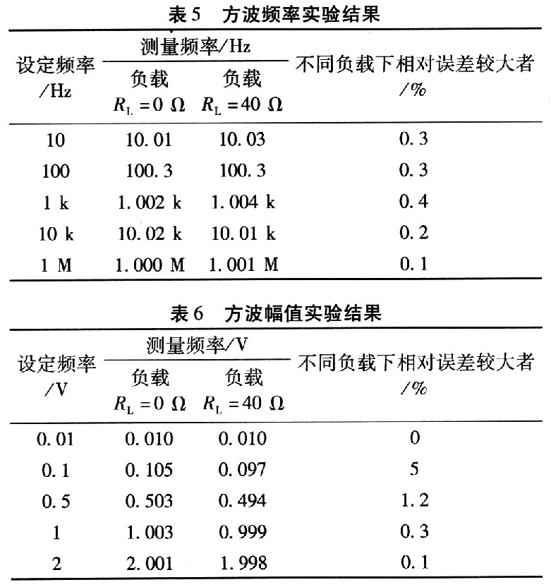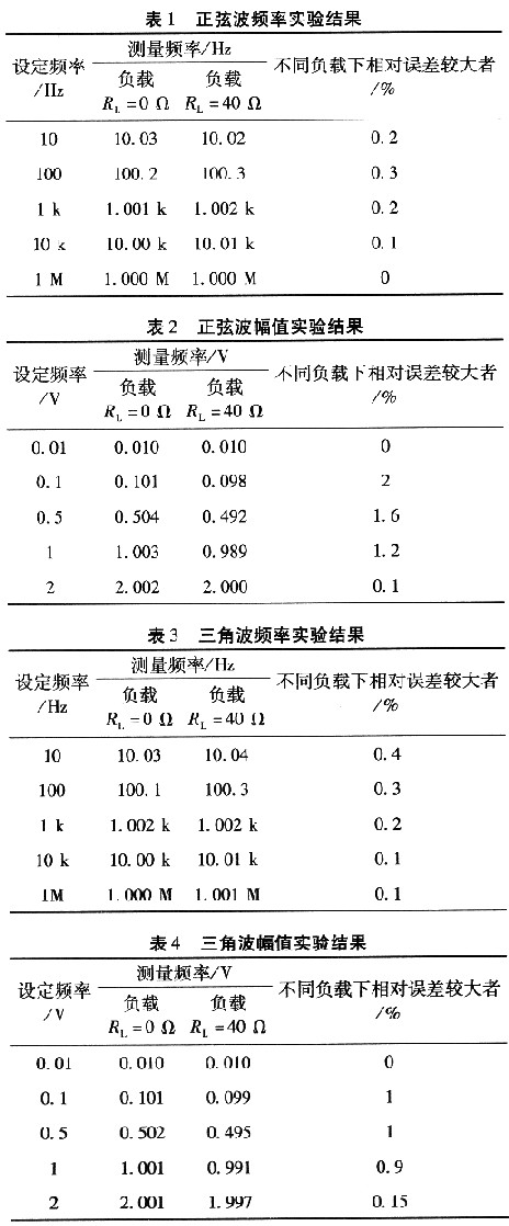 从实验结果可以看出,本信号发生器系统产生的正弦波、三角波和方波,其频率的相对误差均低于0.5%,其幅值的相对误差均低于5%,满足设计要求。