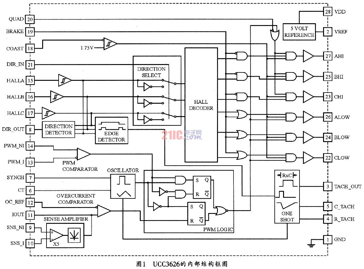 方便地与一个外部时钟进行同步。此外,UCC3626还设有一个QUAD选择端,以用于选择输出功率桥四象限或两象限斩波控制,也就是决定高侧开关和低侧开关,同时,PWM控制或仅低侧开关PWM控制。UCC3626中的差动电流传感放大器和绝对值电路可为电动机的控制建立一个正确的电流并提供逐周的电流保护。另外,为实现速度控制,该器件还提供有精密测速电路。它的TACH_OUT速度信号是一个变占空比的频率输出信号,可直接用于数字速度控制,或经滤波后提供一个模拟速度反馈信号。而UCC3626中的COAST则可用于控制电机的启动和停止,BRAKE制动数字输入端可使器件进入制动模式,DIR_IN和DIR_OUT为转向输入输出控制。UCC3626的内部结构框图如图1所示。其芯片的主要特点如下: