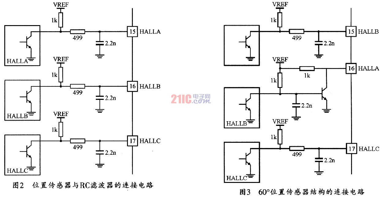 UCC3626原设计用于120°的位置传感器结构,如果需要用在60℃电动机位置传感器结构的场合,则可按图3所示的方法将B相霍尔信号经反
