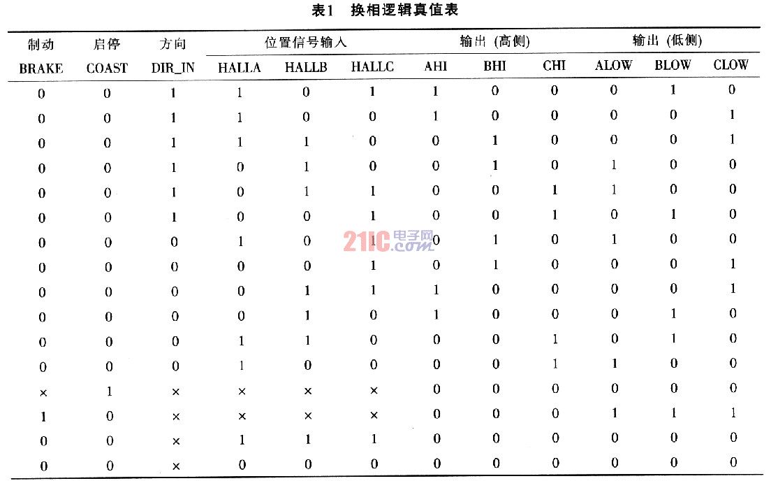 UCC的三个位置传感器与RC低通滤波器的连接电路如图2所示。图中,三个霍尔位置传感器产生的位置信号,经上拉电阻和RC低通滤波后,可连接到UCC3626的HALLA、HALLB、HALLC信号输入端,并且滤波器应尽可能靠近UCC3626,表1给出了UCC3626的换相逻辑真值表,同时给出了六个输出( AHI、BHI、CHI、ALOW、BLOW、CLOW)随输入(BRAKE、DIR_IN、DIR OUT、HALLA、HALLB和HALLC)的变化而改变的译码逻辑。