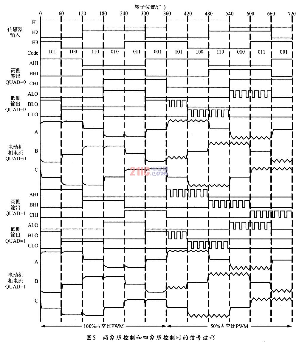 UCC3626可通过QUAD端选择两象限和四象限控制。当QUAD为0时,为两象限控制,此时UCC3626只对功率开关的低侧进行PWM控制;而当QUAD为l时,为四象限控制,此时高侧开关和低侧开关同时进行PWM控制。图5给出了两象限和四象限控制时的主要电流信号波形。