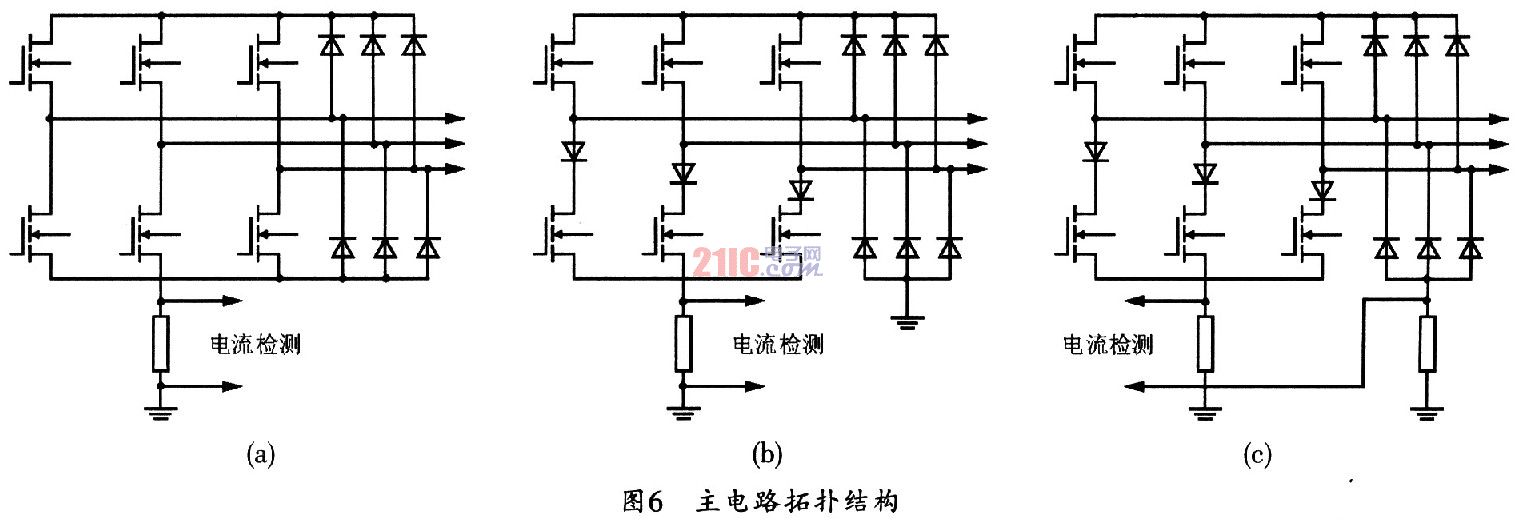 地,以避免制动电流流过下半桥。图6(c)所示电路适用于需要制动功能且为四象限控制的场合,附加的传感电阻可用来检查PWM的OFF电流。