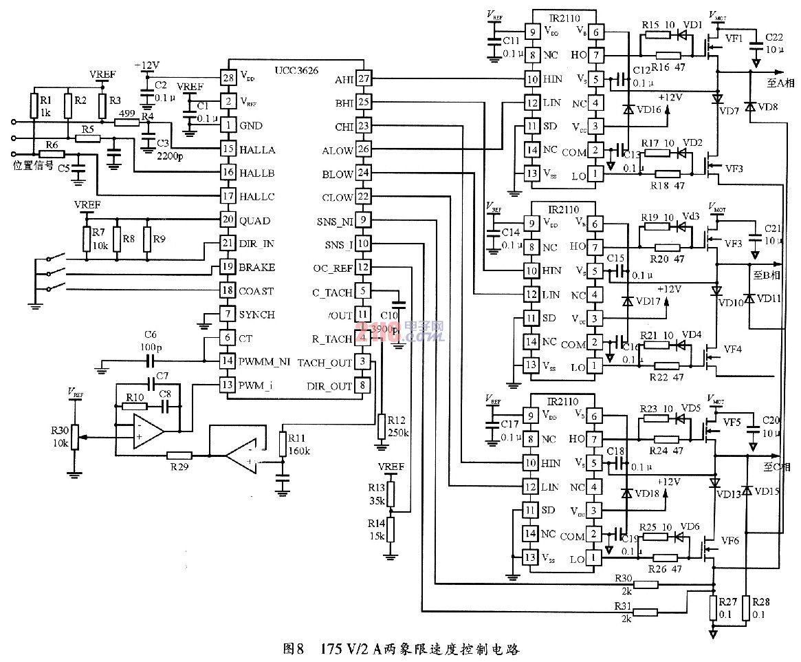 基于UCC3626和IR2110的175 V/2 A两象限速度控制电路如图8所示。该电路通过三片IR2110与功率MOSFET相连。控制器的速度指令取自电位器R30,而R11和C9可对TACH_OUT速度反馈信号进行滤波和缓冲,放大器U5A可提供速度控制回路的小信号补偿,其输出可控制PWM,并以积分电容C8和电阻R10作为校正元件。