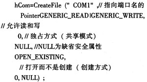 串口通信程序以调用CreatFile()函数开始,该函数的返回值是一个句柄。可在随后的其它端口操作中使用。一旦端口处于打开状态,就可以自动分配一个发送/接收缓冲区,当然,也可以通过调SetComm()函数来改变发送/接收缓冲区的大小。