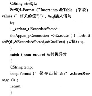 首先打开数据库的连接。若m_pConnection在程序初始化中已经打开,则可在窗体类中直接调用,然后进行数据的存储。代码如下: