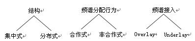 基于结构的频谱共享技术可分为集中式频谱共享和分布式频谱共享。前者解决方案主要是集中单元控制频谱分配和接入过程。网络中的每个分布式节点都把自己探测感知的频谱信息汇集到集中控制单元,由它绘制出频谱分配映射图。后者解决方案主要应用在不能构建集中式结构的场合。相应地,在这种情况下,每个分布式节点都参与频谱分配。基于频谱分配行为的共享技术,可以分为合作式频谱共享和非合作式频谱共享。合作式频谱共享解决方案考虑到节点的行为会影响到其他的节点。也就是说,每个节点的感知所得都会与其他节点分享,而且,频谱分配算法也会考虑到这些信息。集中式解决方案可以看作是合作式的,同时也存在着分布式的合作方案。非合作式频谱共享与合作式方案不同,非合作式方案仅考虑自己节点的行为,因而这种方案也被称作是“自私”的。非合作式方案可能会导致频谱利用率的降低,但在实际应用中,它对其他节点的通信要求最低。基于接入技术的频谱共享分为Overlay频谱共享和Underlay频谱共享。Overlay频谱共享具体来讲就是一个认知节点利用未被使用的一段频谱接入网络,这种情况下对第一用户造成的干扰最小。Underlay频谱共享利用蜂窝网络的频谱扩展技术,一旦获得了频谱分配射影图,认知节点便开始传输。在这段频谱上,第一用户把认知节点的传输当成噪声来处理。因而,这种方案需要复杂的频谱扩展技术。与Overlay频谱共享方案相比,Underlay频谱共享可以利用更宽的宽带。对CR网络中频谱接入的理论研究揭示了在设计频谱接入协议时候要考虑的权衡问题。比如,合作式方案的优势在于它能够提高频谱利用率和公平性,然而,如果考虑到诸如用户之间频繁的信息交换这些成本开销的话,它的优势就不是很明显了;又比如,Overlay技术关注的重点是频谱孔,Underlay技术必须要结合动态扩展技术才能避免对第一用户造成干扰,如果考虑到系统的复杂性和性能之间的均衡,混合技术应当优先考虑。
