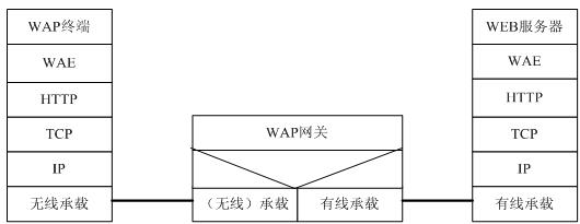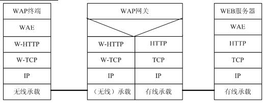 与WAP1.2相比较,在WAP2.0协议栈取消了WSP、WTP、WDP,而代之以HTTP和TCP/IP;这种无线数据传输技术的改进带来了传输速率及传输可靠性的有效提高。WAP2.0网关的通用协议栈如下: