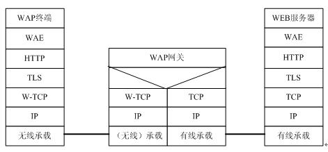 上图中WAP网关作为HTTP代理;WAP网关也可以作为业务安全承载代理或直接访问中转点,协议栈如下: