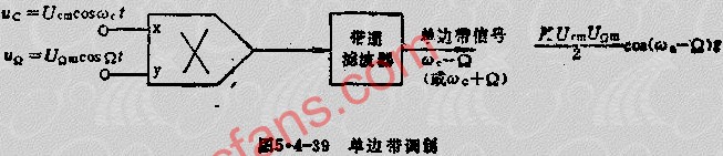 由于双边带中的任何一个边带都包含调制信号的全部信息,因而抑制一个边带而只传输,只要在图5.4-38所示的调制器的输出端加一个带通滤波器,就构成了单边带调幅器。如图5.4-39所示。
