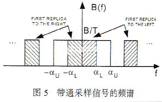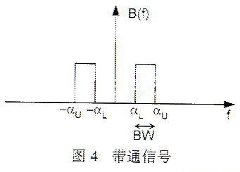 图3给出了被混叠的采样信号。高频信号分量fH叠加在低频部分。设计时,通常用一个低通滤波器来恢复原始频谱并将其它频谱分量滤掉。当使用截止频率为α的低通滤波器恢复图3信号时,它无法将混叠的高频信号滤掉,从而造成信号的劣化。 3 带通信号的采样和混叠分析 再来看另一种有限带宽信号,带通信号。带通信号的低频截止点不在0HZ。图4中的带通信号的频谱能量范围在αL和αU之间,它的带宽定义为αU-αL。带通信号和基带信号的主要差异就是带宽的定义。基带信号的带宽等于它的高频截止频率,而带通信号的带宽等于高频截止频率和低频截止频率之差。由前面的讨论可知,采样信号以1/T 的周期重复原始信号的频谱。因为这个频谱实际上包括从0Hz到原始带通信号低频截止频率之间的0幅值频带,所以实际的原始带通信号带宽要比αU小。