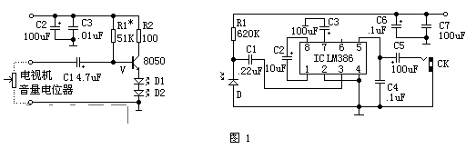 转发器由发射和接收两部分组成。见附图1。鉴频后的伴音(音频)信号经三极管V放大后推动红外发射管。由于发射管的发光强度与通过的电流成正比,所以D1、D2所发出的红外光线便受到音频信号的调制。为了防止失真,D1、D2要设置一定的偏置。