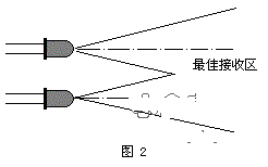 调节发射部分三极管V的静态电流在30mA左右。接收部分只要安装无误,不需调试即可工作。发射部分可以安装在电视机内部,采用机内12V电源供电。信号输入A、B端,接到音量电位器两端即可。对于采用集成电路的直流音量控制的电视机,可以将A、B两端接到喇叭的两端。不过要增加一只开关,将喇叭关断(也可利用耳机输出插孔),调节音量电位器,使其转发距离最远且不失真。两只发射管安装时,要考虑其辐射区范围。红外发射管的辐射角一般在60度左右,所以安装时要使它们的辐射有一部分重迭,如图2所示。