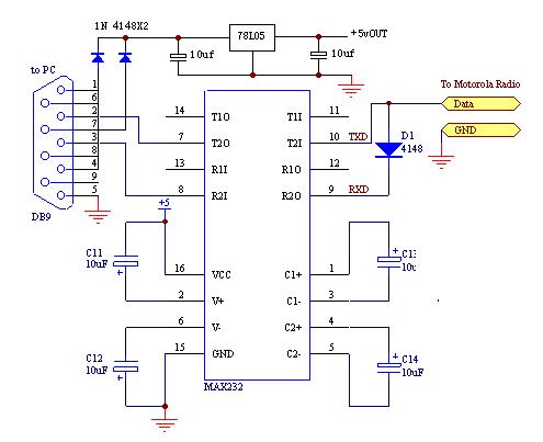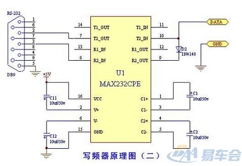 下面两张写频器电路图都是用了MAX232这个电脑串口电平转换专用芯片,它有着兼容性好、稳定性好、外围电路简单、容易制作等优点。