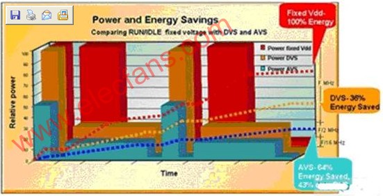 图1:对比固定电压工作模式,DVS和AVS技术实现的节能情况。
