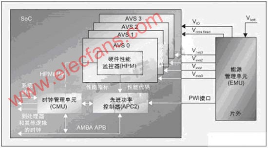 AVS是一种系统级解决方案,可以对SoC中的各个处理引擎的电源电压进行独立的自动控制,从而降低数字SoC解决方案的能耗。AVS把可综合的与先进微控制器总线架构(AMBA)兼容的内核,以及先进功率控制器(APC)嵌入在SoC中,如图2所示。