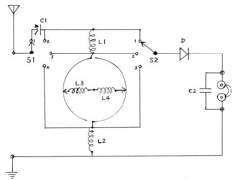 可见这种线圈的 Q 值并不高,尤其是内外两线圈反转,电感互相抵消的时候,Q 值更低。但是用它做矿石机调谐,可以不用可变电容器,线路更简单。下面是电路图。利用天线的分布电容(一般有数十到一百多 pf )和线圈并联,组成电感调谐电路,连固定电容器也可以省掉。