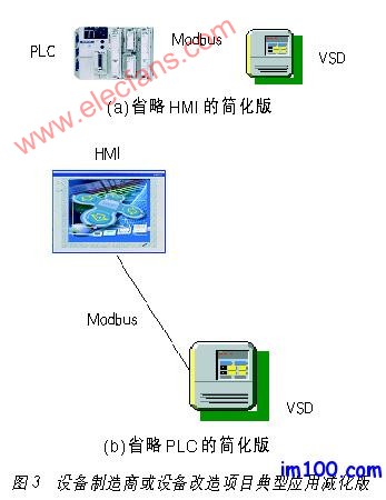 这是一种设备制造商(OEM)和传统设备改造时经常使用的方案,典型配置如图2。图中人机界面(HMI)可以是图形或文字的,一般文字型HMI比图形的HMI要价格低廉。图中的