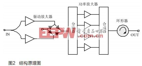 固态功放性能指标主要有:工作带宽、增益、增益平坦度、稳定性、三阶交调、输入输出电压驻波比(VSWR)等。单级放大器由于工作状态、线性度、工艺等的限制难以满足设计要求,实际应用中一般采用多管并联的方式来合成功率。FY-2E气象卫星地面应用系统中的固态功放是采用4管并联的合成方式(见图2)。