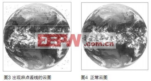 2009年12月发现所收到的一张卫星云图,如图3所示,出现大量麻点和丢线,误码率为10-3个数量级(正常情况下为≤10-6),而接收的遥测信号AGC电平、给卫星发送的遥控指令、DPL的SSD跟踪均无误,由此可定位为信道部分必有强干扰。再检查信道部分设备的运行情况,发现问题在固态功放,其输出功率为47dBm,反射功率达到43dBm, 根据公式:反射系数 ,驻波,可以计算出驻波比为4.4,已经大大超过了正常值1.3。对于如此大驻波比产生的原因,进行了研究与排查,发现最近天气剧变,温度下降、大雪纷飞、空气湿度大,而充气机启动次数较多,且干燥剂变红失效,判定是波导系统漏气,机房的湿空气不能得到很好地干燥,直接充到天馈线中,而馈线在外遇冷凝结成冰块,致使传输网络阻抗失配,驻波比超标,给接收信号带来强干扰。针对此情况,我们配合设备厂家,对波导内湿空气进行了全部清理、在波导接口处加了密封垫。在处理完后,输出功率为46dBm,反射功率为28dBm,驻波比值正常,接收到的正常云图如图4所示。