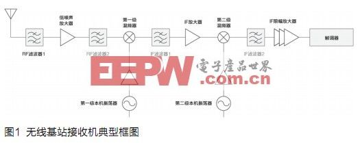 我们首先分析无线基站中的典型接收机方框图(图1)。因为接收到的信号经过两次连续的下变频,变换到较低频率,这些接收机被称为超外差式接收机。如图所示,信号通过天线接收,然后经过第1级RF滤波器滤波,该滤波器通常用于滤除无用信号。随后,该滤波器输出通过一个LNA (低噪声放大器)进行放大,该放大器通常具有非常低的噪声系数。
