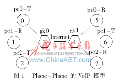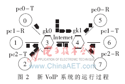 新VoIP系统在NS-2平台下的运行情况如图2所示。在该运行模型中,节点2~7之间流量的大小代表了网关节点3~4之间链路的状况。即当节点2~7之间传送的网络数据很大时(>1 Mb),则认为节点3~4之间的链路发生了拥塞状况;当节点2~7之间传送的数据量较小时(<1 Mb),则认为不会发生拥塞状况。节点0~6是语音数据包的发送节点,且具有根据网络质量来自适应地调整语音发送速率的功能,其中初始发送速率为12.2 Kb/s;数据包的发送用NS-2自带的Pareto分布流量产生器,这主要是考虑到话音激活检测技术(VAD)对IP话音的影响[2]。