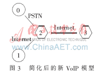 此外,为了更加方便和有效地分析实验数据,需要对上述VoIP模型进行简化处理,简化后的VoIP传输模型如图3所示。其中节点2为网关,节点3既是网关也是所有网络数据的接收节点;节点0为语音数据包的发送节点,节点1为网络数据量的发送节点。