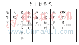 通信模块的通信协议根据DNP3.0规约制定,数据链路层的数据采用一种可变帧长格式:FT3。一个FT3帧被定义为一个固定长度的报头,随后是可以选用的数据块,每个数据块附有一个16 位的 CRC 校验码。固定的报头含有两个字节的起始字,一个字节的长度(LENGH),一个字节的链路层控制字 (CONTROL),一个16位的目的地址,一个16位的源地址和一个16位的CRC校验码,其帧格式如表1所示。
