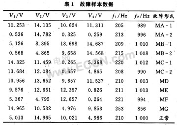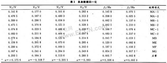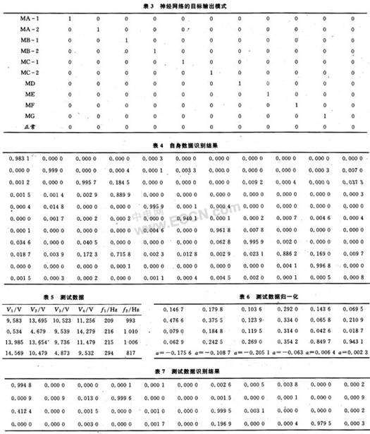 表1为实验测得的故障样本数据;表2为归一化后的数据,其激活函数采用S型函数f=1/(1+e-ax);表3为神经网络的目标输出模式,1表示有故障,0表示正常。