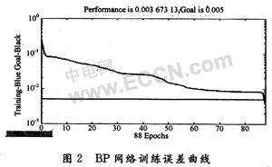 ,a取1~10,本实验中a取7(根据训练误差曲线调整而得),N2=15。学习率η=0.2,训练误差E<0.005,最大训练次数n=1 000。图2为BP网络的训练误差曲线。