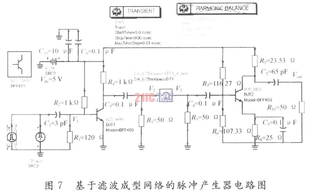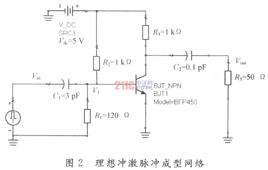 利用Agilent的ADS2006A对电路进行仿真设计,理想冲激脉冲发生器由激励信号源,微分网络,零偏置放大电路组成,如图2所示。